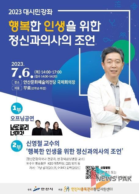 뉴스팍 이소율 기자 | 안산시 중독관리통합지원센터는 내달 6일 안산문화예술의전당에서‘행복한 인생을 위한 정신과의사의 조언’시민강좌를 개최한다고 21일 밝혔다.
