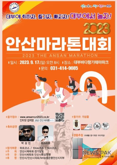 뉴스팍 이소율 기자 | 안산시는 시민들의 건강한 여가활동 및 생활체육 활성화를 위해 ‘2023 안산마라톤대회’를 오는 9월 17일 대부바다향기테마파크 일원에서 개최한다고 7일 밝혔다.