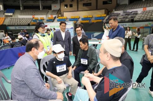 뉴스팍 이화형 기자 | 수원시의회 김기정 의장과 이재식 부의장을 비롯한 시의원들은 21일 수원종합운동장에서 열린 ‘제19회 수원특례시 장애인한마음체육대회’에 참석한 선수단과 응원에 나선 보호자 및 시민들을 격려했다.