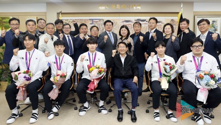 뉴스팍 이화형 기자 | 수원특례시의회은 20일 제19회 항저우아시안게임에 출전한 선수단 및 지도자들을 시의회에 초청해 환영과 축하의 마음을 전했다.