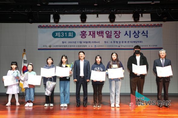 뉴스팍 이화형 기자 | 수원특례시의회는 16일 (사)수원문인협회 주최로 팔달문화센터 대강당에서 개최된 제31회 홍재백일장 시상식에 참석하여 시상과 함께 수상자들에 대한 격려를 전했다.