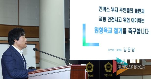 뉴스팍 이소율 기자 | 김운남 의원(일산3동·대화동, 더불어민주당)이 20일 열린 고양시의회 278회 임시회에서 킨텍스 부지에 있는 원형육교의 철거를 촉구했다.