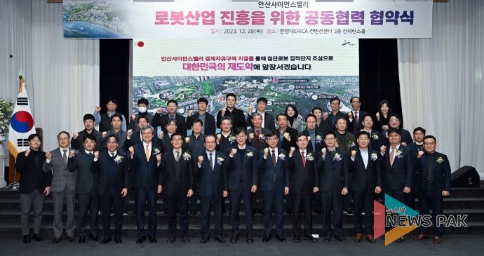 뉴스팍 류은정 기자 | 안산시는 지난 28일 대한민국 로봇·제조 산업을 이끄는 11개 관련기관과 ‘안산사이언스밸리 경제자유구역 후보지 로봇산업 진흥을 위한 공동협력 협약’을 체결했다고 29일 밝혔다.