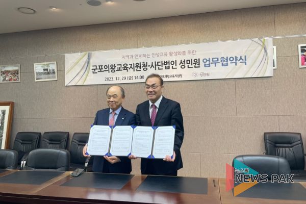뉴스팍 배상미 기자 | 경기도군포의왕교육지원청은 2023년 12월 29일 사단법인 성민원과 군포의왕 지역의 인성교육 활성화를 위해 인성교육 업무협약(MOU)을 군포제일교회에서 체결했다.
