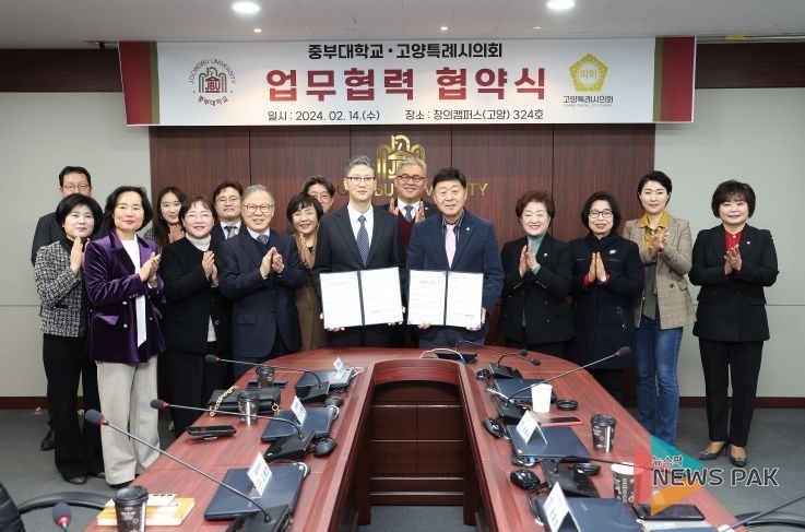 뉴스팍 배상미 기자 | 고양특례시의회는 14일 고양시 소재 중부대학교 창의캠퍼스에서 중부대학교(총장 이정열)와 관학 협력 업무협약을 체결했다.