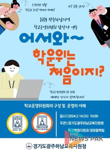 뉴스팍 류은정 기자 | 광주하남교육지원청은 2월 14일 유·초·중·고 및 특수학교의 학교(유치원)운영위원회 업무담당자(간사) 140여 명을 대상으로 온라인 역량 강화 연수를 실시했다.