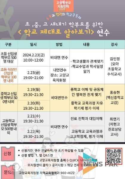 뉴스팍 배상미 기자 | 경기도고양교육지원청 학부모지원센터는 초·중·고등학교 신입생 학부모 대상 집중교육을 입학 전인 2월 19일부터 23일까지 학교급별 2회씩 총 6회 대면과 비대면으로 진행한다고 밝혔다.