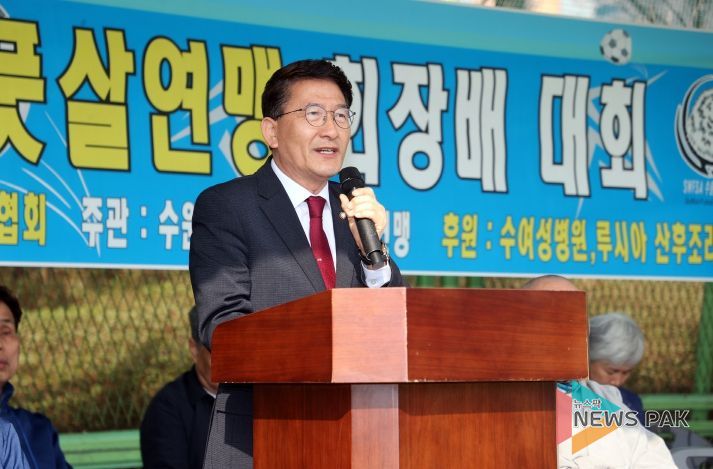 뉴스팍 이화형 기자 | 수원특례시의회 김기정 의장이 7일 수원시 권선구 고색동 솔대축구장에서 열린 수원시풋살연맹회장배 대회에 참석하여 관계자들을 격려했다.