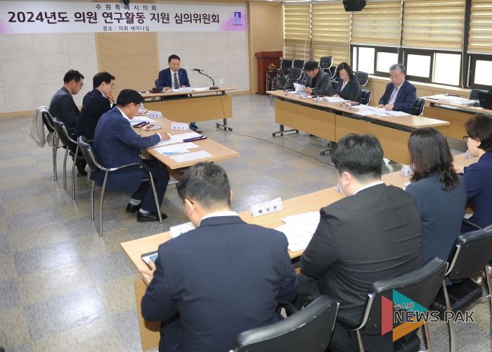 뉴스팍 이화형 기자 | 수원시의회는 15일 의회 세미나실에서 ‘수원시의회 의원연구활동 지원 심의위원회’를 열고 2024년도 의원연구단체의 등록과 연구활동 계획 승인에 관한 사항을 심사했다.