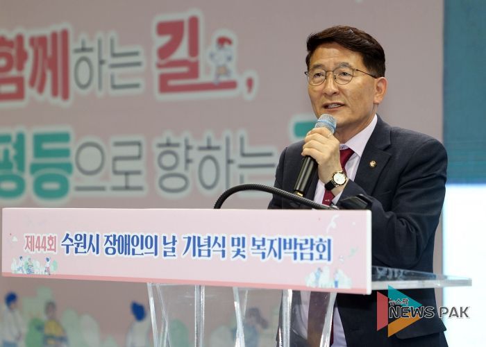 뉴스팍 이화형 기자 | 수원특례시의회 김기정 의장이 17일 수원종합운동장 실내체육관 및 주차장 일원에서 열린 '제44회 수원시 장애인의 날 기념식 및 복지박람회'에 참석했다.