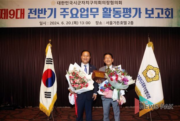 뉴스팍 이화형 기자 | 수원특례시의회 김기정 의장이 20일 서울 마포구 서울가든호텔에서 열린 전국의장단 전반기 평가보고회에서 대한민국시군자치구의회의장협의회 공로패를 수상했다.