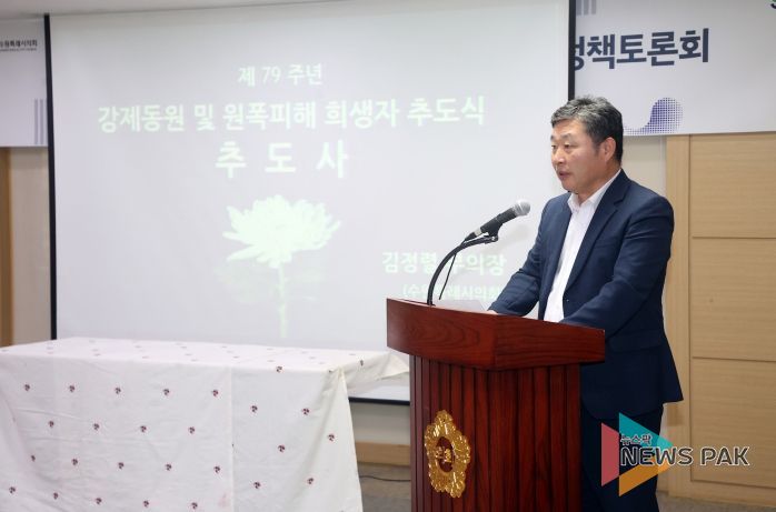 본 토론회에 앞서 식전행사로 진행된 “제79주년 강제동원 및 원폭피해 희생자 추도식”은 김정렬 수원특례시의회 부의장과 사정희 수원특례시의회 시의원(더불어민주당, 매탄1·2·3·4동), 행사 관계자 등 40여 명이 참석해 희생자를 기리는 묵념과 박상복 경기도원폭피해자협의회 회장과 김정렬 수원특례시의회 부의장의 추도사, 추모시 낭독, 헌화 순으로 진행됐다.