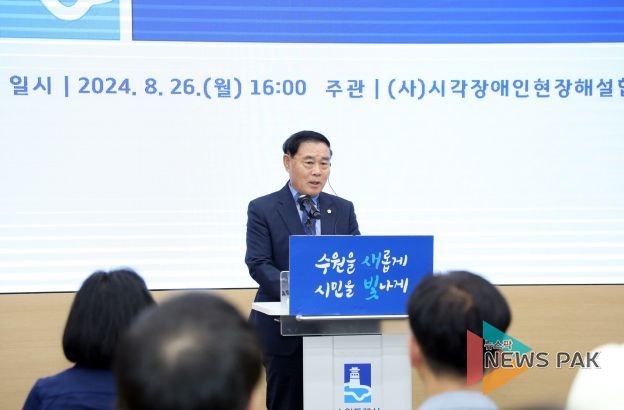 뉴스팍 이화형 기자 | 수원특례시의회 이재식 의장이 26일 수원시청 중회의실에서 열린 시각장애인현장해설협회 수원시지부 창립식에 참석했다.