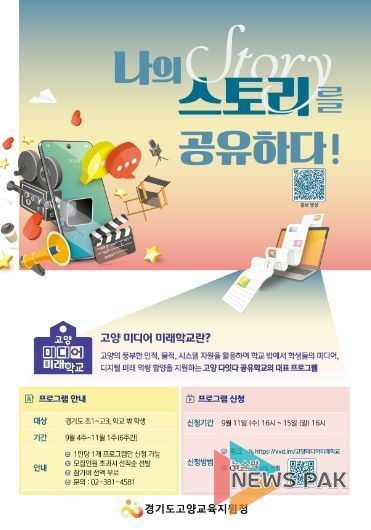 뉴스팍 배상미 기자 | 경기도고양교육지원청은 9월 11일부터 ‘고양 미디어 미래학교’에 참여할 학생을 모집한다. 고양 미디어 미래학교는 고양 다잇다 공유학교의 대표 프로그램으로 학교 밖에서 학생들의 미디어, 디지털 미래 역량 함양을 지원할 예정이다.