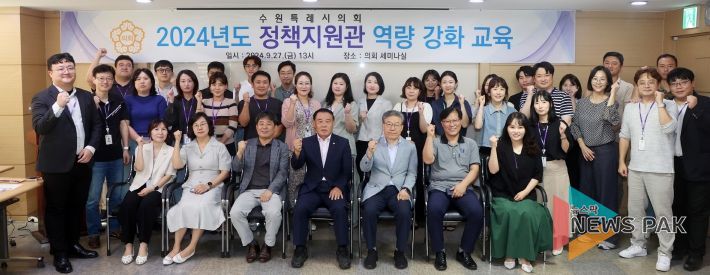 뉴스팍 이화형 기자 | 수원특례시의회는 9월 27일 의회 세미나실에서‘수원특례시의회 정책지원관 역량강화교육’을 실시했다.