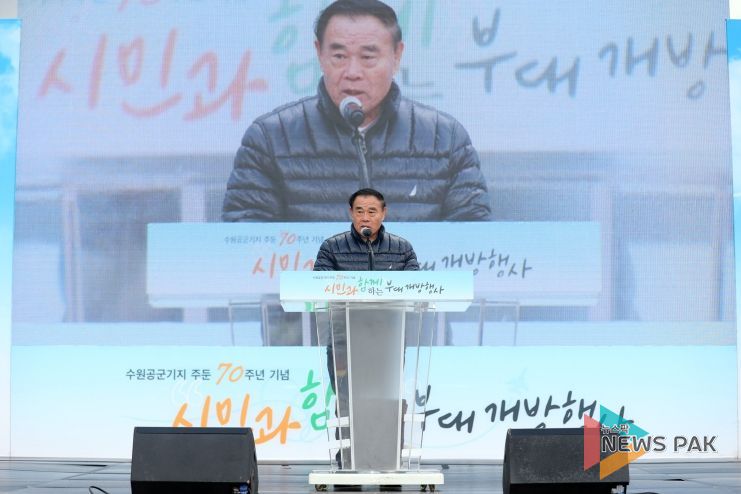 뉴스팍 이화형 기자 | 수원특례시의회가 26일 공군 제10전투비행단에서 열린 수원비행장 수원주둔 70주년 기념행사에 참석했다.