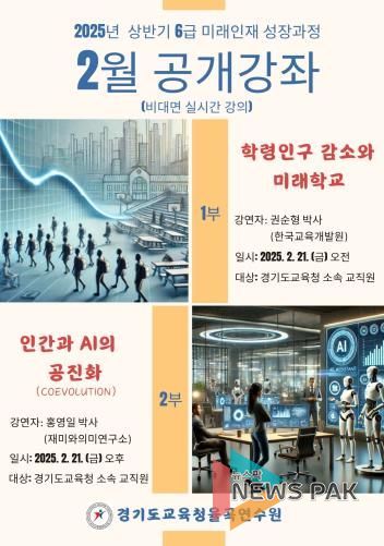 뉴스팍 배상미 기자 | 경기도교육청율곡연수원이 미래 교육변화 교직원들의 동반 성장을 위해 올해 ‘상반기 6급 미래인재 성장과정’ 일부 연수를 매월 공개강좌로 실시한다고 밝혔다.