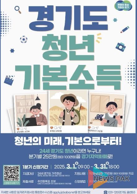 경기도 3년 이상 계속, 10년 이상 합산 거주 24세 청년, 분기별 25만원씩 지급