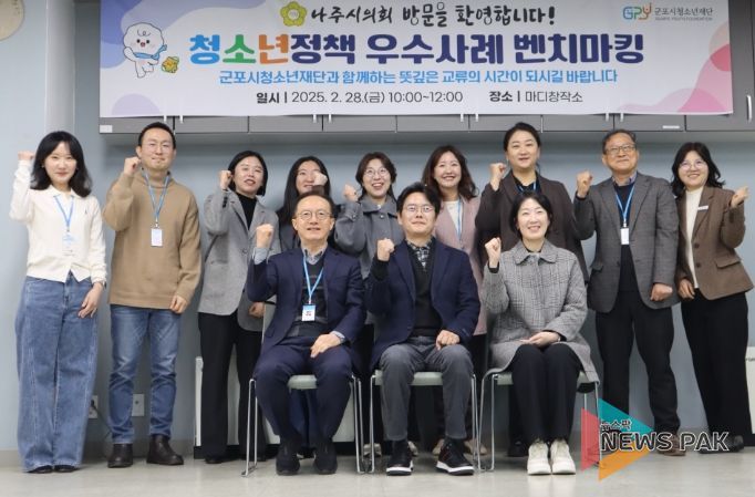 뉴스팍 배상미 기자 | 군포시청소년재단은 나주시의회 청소년 정책연구회 방문단을 맞아 2025년 2월 28일 군포시청소년재단에서 환영 행사를 진행했다. 이번 방문은 청소년 정책 및 사업 운영과 관련한 정보 교류와 우수 사례 공유를 목적으로 이루어졌으며, 나주시의회 소속 의원 및 주무관, 미래교육센터 팀장이 참석했다.