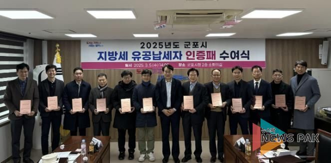 뉴스팍 배상미 기자 | 군포시 하은호 시장은 3월 5일 지방세를 성실하게 납부하여 지방재정 확충에 기여한 유공납세자 15개 법인에게 ‘유공납세자 인증패’를 수여하고 감사의 마음을 전했다.