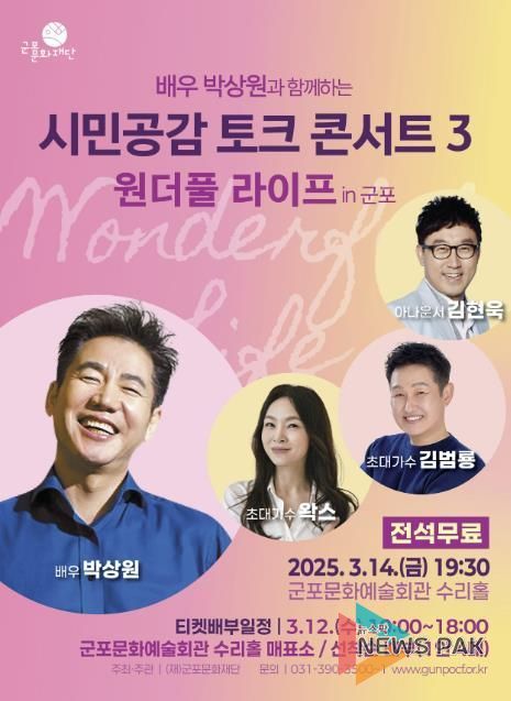뉴스팍 배상미 기자 | 군포문화재단은 오는 14일 저녁 7시 30분, 군포문화예술회관 수리홀에서 배우 박상원과 함께하는 ‘시민 공감 토크 콘서트 시즌 3 - 원더풀 라이프 in 군포’를 개최한다.