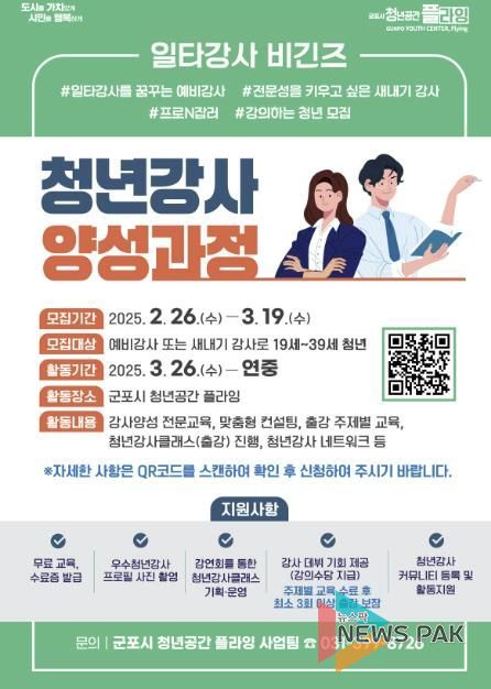 뉴스팍 배상미 기자 | 군포시 청년공간 플라잉은 일타강사를 꿈꾸는 청년을 대상으로 ‘일타강사 비긴즈-청년강사 양성과정’을 개설하고 오는 19일까지 참여자를 모집한다고 11일 밝혔다.