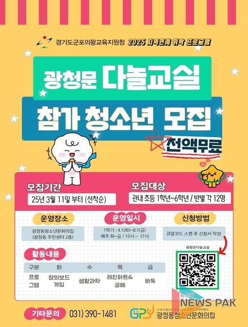 뉴스팍 배상미 기자 | (재)군포시청소년재단 군포시지역청소년센터 광정동청소년문화의집에서는 2025년도 군포의왕교육지원청 지역연계 위탁 프로그램 '광청문 다놀교실'에 참가 청소년을 모집한다.