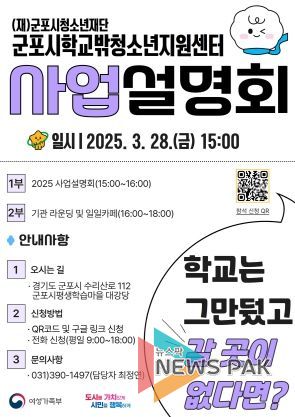뉴스팍 배상미 기자 | 군포시청소년재단, 군포시학교밖청소년지원센터는 오는 2025년 3월 28일 15시에 사업설명회를 개최하여 학교를 다니지 않는 청소년들을 위한 다양한 지원 프로그램을 소개하는 자리를 가진다.