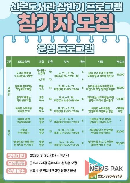 뉴스팍 배상미 기자 | 군포시 산본도서관이 4세 아동부터 성인들까지 다양한 연령대의 이용자를 대상으로 마련한 상반기 독서진흥프로그램의 참가자를 모집한다.
