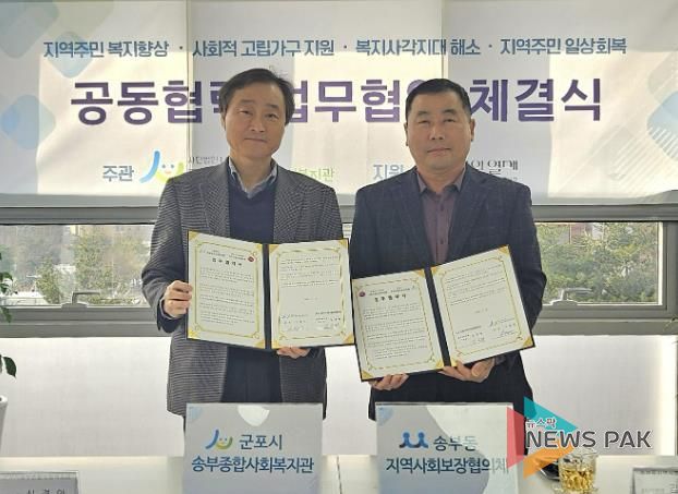 뉴스팍 배상미 기자 | 군포시 송부동 지역사회보장협의체와 군포시 송부종합사회복지관이 3월 17일 관내 지역주민의 복지 향상 및 사회적 고립가구 지원 협력체계 구축을 위한 업무협약을 체결했다.