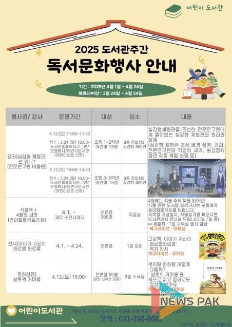 뉴스팍 배상미 기자 | 군포시 어린이도서관은 오는 4월 도서관 주간을 맞아 어린이와 가족이 함께 즐길 수 있는 다양한 행사를 마련했다고 밝혔다. 이번 행사는 도서관 문화를 알리고, 독서와 체험을 통해 어린이들의 상상력과 창의력을 키우는 데 목적을 두고 있다.
