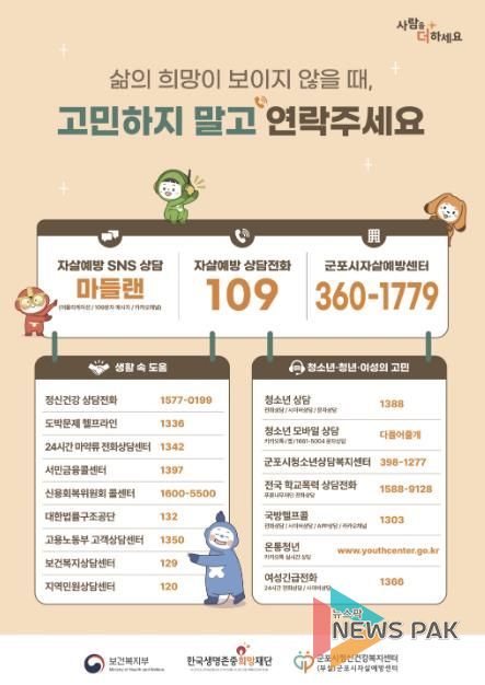 군포시정신건강복지센터(부설)군포시자살예방센터는 "자살 고위험 시기에 맞춰 적극적인 홍보로 정신적인 어려움을 겪고 있는 분들은 언제든지 전문 상담 서비스를 이용해 주시길 바라며, 도움이 필요한 시민들이 적시에 도움을 받을 수 있도록 노력하겠다"고 말했다.