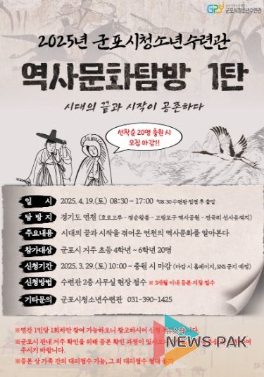 뉴스팍 배상미 기자 | (재)군포시청소년재단 군포시청소년수련관에서 청소년들의 역사의식 제고 및 중요성을 상기시키고자 청소년 역사문화 탐방 1회차 참가자를 모집한다.