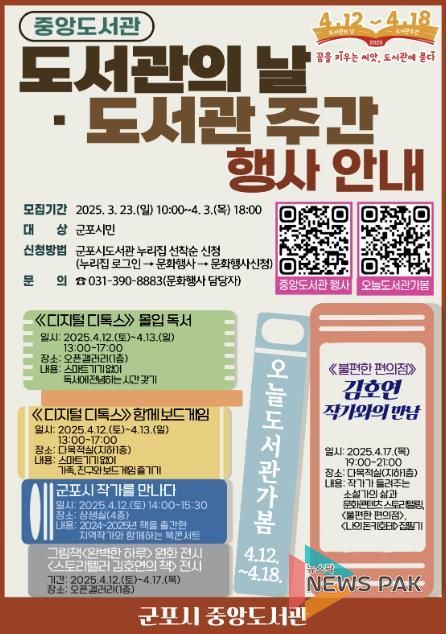 뉴스팍 배상미 기자 | 군포시 중앙도서관은 도서관의 날(2025. 4. 12.) 및 도서관주간(2025. 4. 12.~4. 18.)을 맞이하여 특별 행사를 펼칠 계획이다.