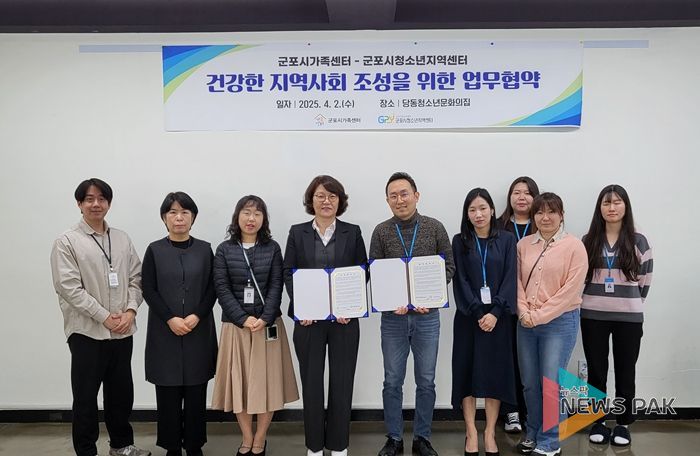 뉴스팍 배상미 기자 | (재)군포시청소년재단 군포시청소년지역센터와 군포시가족센터는 관내 청소년과 가정의 건강한 성장을 지원하기 위해 업무협약(MOU)을 체결했다.