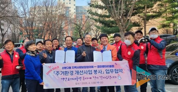 뉴스팍 배상미 기자 | 군포시 산본2동 지역사회보장협의체는 지난 4월 1일 경안로타리클럽과 “주거환경 개선사업 봉사” 업무협약식을 가졌다. 이번 협약을 통해 경안로타리클럽은 취약계층의 주거환경 개선을 위한 집수리 봉사활동을 진행할 예정이다.