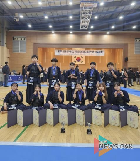 뉴스팍 배상미 기자 | 산곡초등학교 검도부 학생들이 지난 5일 경기도 파주시 월롱체육관에서 열린 제2회 경기도 초등학생 검도대회에서 뛰어난 활약을 펼쳤다. 고학년 남자 단체전(이승헌, 유성호, 김주영, 장태우, 이유진)과, 여자 단체전(김지연, 이하니, 김다율, 류가윤, 정윤아, 임지은)에서 동반 동메달을 획득하며 대회에 참가한 모든 선수들이 메달을 손에 넣는 쾌거를 이루었다.
