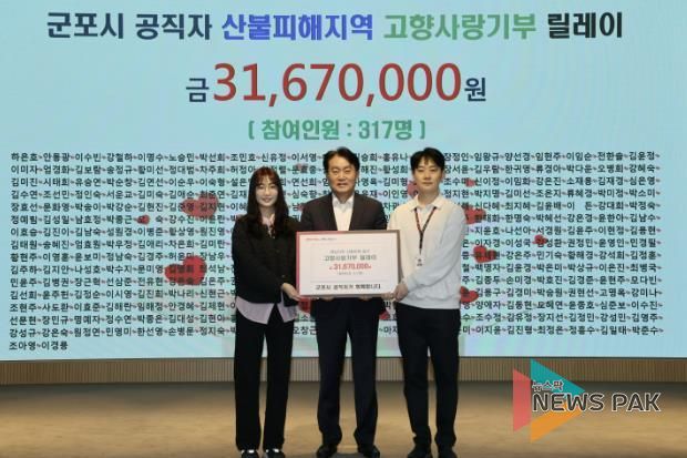 뉴스팍 배상미 기자 | 군포시는 소속 공무원들이 지난 역대 최악의 산불로 인해 피해가 극심한 경북 의성군을 비롯한 8개 자치단체에 총 3,167만원을 기부했다고 밝혔다.