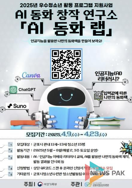 뉴스팍 배상미 기자 | (재)군포시청소년재단 군포시청소년수련관은 군포시 관내 청소년의 AI 및 인공지능 리터러시 인식 증진과 AI 프로그램 활용 역량 향상을 위해‘AI 동화 창작연구소'AI 동화 랩'’프로그램 참가자를 모집한다.