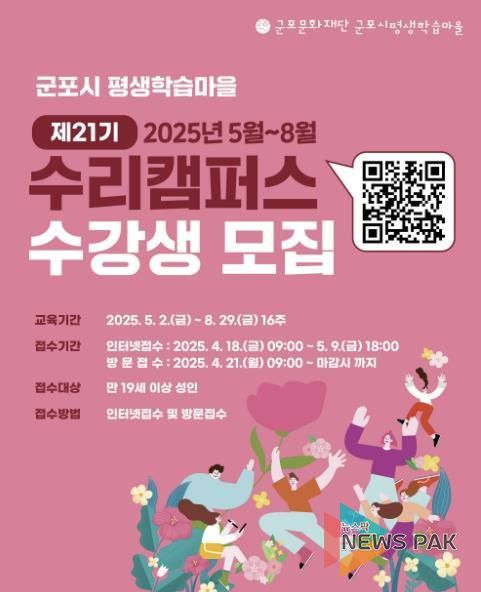 뉴스팍 배상미 기자 | 군포문화재단 군포시평생학습마을은 오는 18일부터 군포시평생학습마을 정규강좌 ‘수리캠퍼스’의 21기 교육 수강생을 모집한다고 밝혔다.