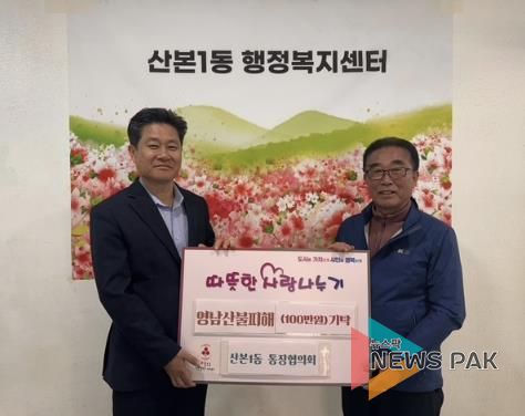 뉴스팍 배상미 기자 | 군포시 산본1동 통장협의회는 지난 11일 영남지역 대형 산불 피해 복구활동 지원을 위한 성금 100만원을 기부했다.