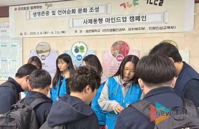 뉴스팍 배상미 기자 | 함현중학교는 학생자치회와 함께 지난 8일(화)부터 3일간 ‘생명 존중, ‘언어 순화’, ‘사제동행’을 주제로 연속 캠페인을 진행했다. 이번 캠페인은 학생 자치 문화의 활성화와 더불어 학생들의 생명 존중 의식 함양, 언어 사용 개선, 그리고 교사-학생 간의 유대 강화라는 의미 있는 목표를 담고 있다.