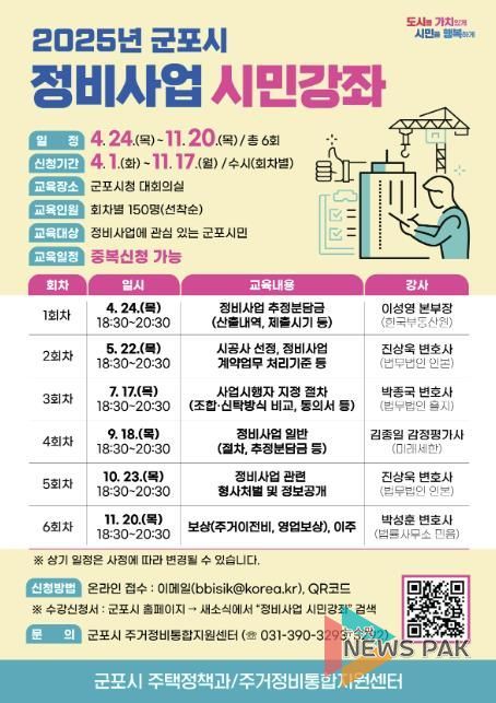 뉴스팍 배상미 기자 | 군포시는 정비사업(재개발, 재건축 등)에 관심 있는 시민을 대상으로, 구역별 추진 단계에 맞춘 “2025년 정비사업 시민강좌”를 개최한다.