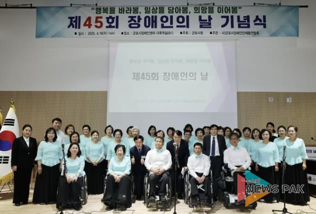 뉴스팍 배상미 기자 | 군포시는 4월 16일 군포시장애인단체총연합회 주관으로 군포시 장애인센터에서 장애인단체 관계자 및 군포시 거주 장애인과 가족 등을 비롯해 하은호 군포시장, 김귀근 군포시의회 의장, 도의원, 시의원 등이 참석한 가운데 제45회 장애인의 날 기념행사를 개최했다.