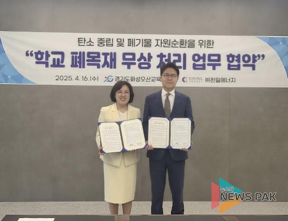 뉴스팍 배상미 기자 | 경기도화성오산교육지원청은 4월 16일 ㈜천일에너지와 학교 폐목재 무상 위탁처리를 위한 업무협약을 체결했다고 밝혔다.
