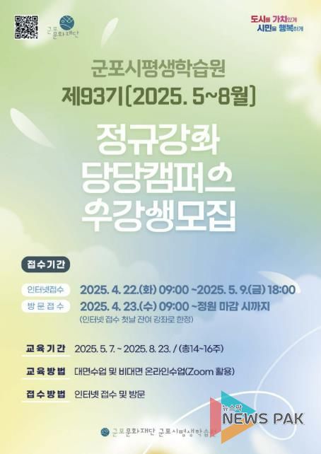 뉴스팍 배상미 기자 | 군포문화재단 군포시평생학습원은 오는 22일부터 군포시평생학습원 정규강좌 ‘당당캠퍼스’의 93기 수강생을 모집한다.