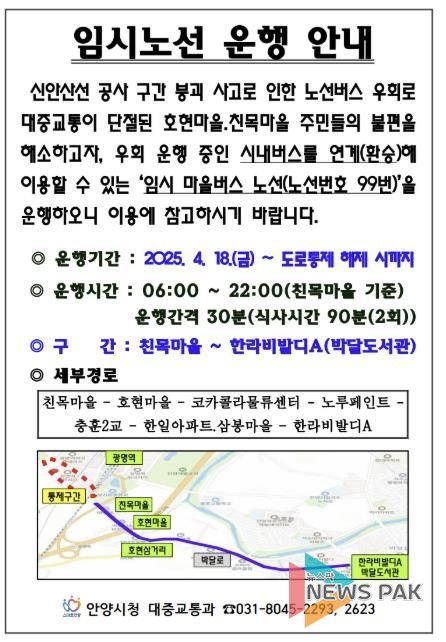 뉴스팍 배상미 기자 | 안양시는 신안산선 공사현장 붕괴 지점 인근 도로가 전면 통제되면서 대중교통 불편을 겪고 있는 박달동 친목·호현마을 주민 등을 위해 오는 18일부터 마을버스 99번(1대)을 긴급 투입해 임시 운행한다고 17일 밝혔다.