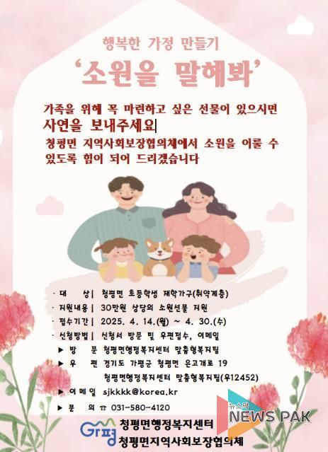 뉴스팍 배상미 기자 | 가평군 청평면지역사회보장협의체(지사협)는 가정의 달을 맞아 저소득층 아동을 위한 특화사업 ‘소원을 말해봐’를 추진한다고 18일 밝혔다.