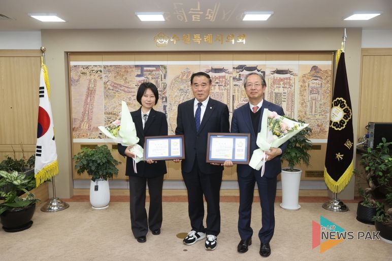 뉴스팍 배상미 기자 | 수원특례시의회는 18일 의장 집무실에서 법률고문 위촉식을 갖고, 향후 2년간 의회 법률고문으로 활동할 변호사를 위촉했다.