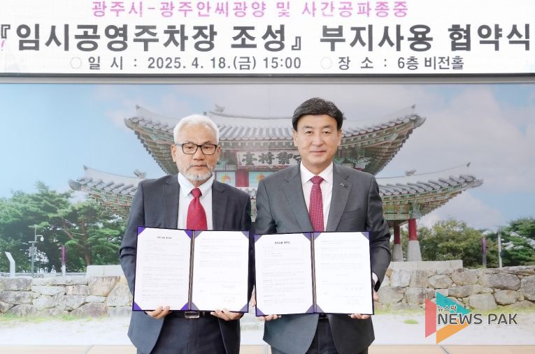 뉴스팍 이화형 기자 | 광주시는 18일 시청 비전홀에서 광주 안씨 광양(사간)공파 종중과 중대동 임시 공영주차장 조성을 위한 부지사용 협약식을 체결했다.